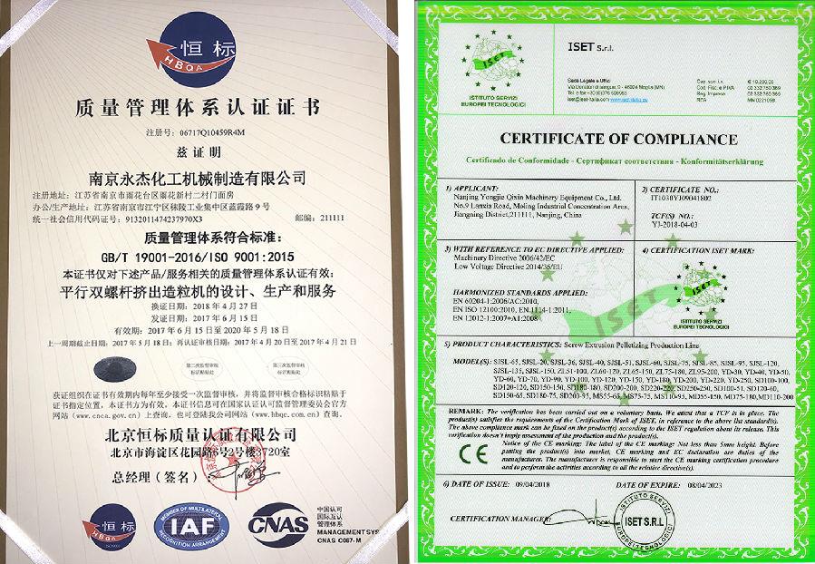 我司的所有造粒機組產(chǎn)品均通過了CE和ISO9001認證,質(zhì)量有保障: